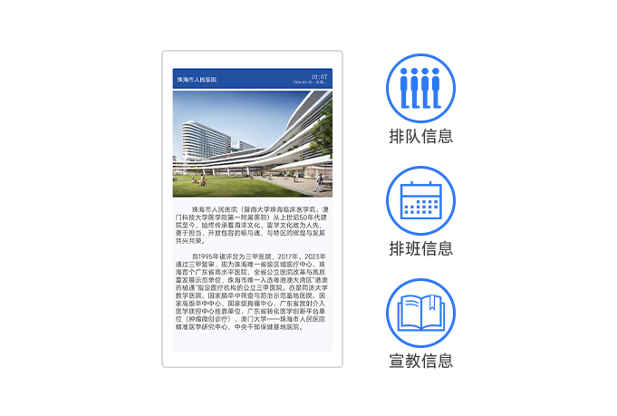 多場景可用:適合安裝在醫(yī)院電梯口、等候區(qū)、診室門口等;1080P:支持1080P文件播放;信息顯示:可用于顯示排隊信息、排班信息、健康宣教信息等;軟件管理:軟件簡潔易用,一站式